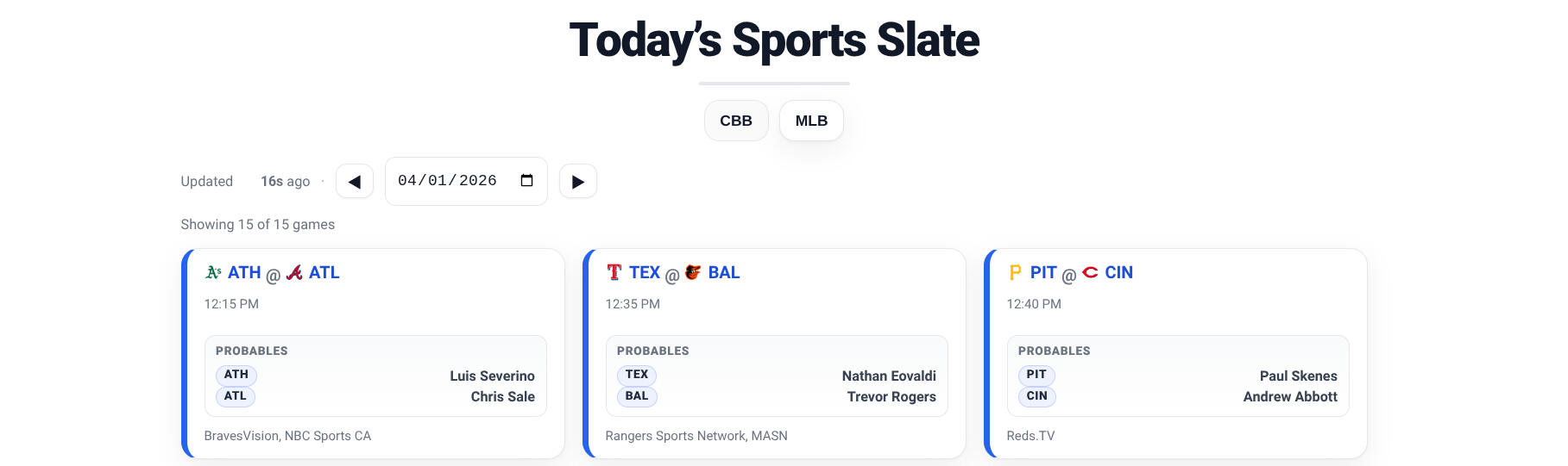 A real-time dashboard for college basketball and MLB featuring live scores, predictive models, and custom filtering tools. Built to make sports data more accessible and actionable.